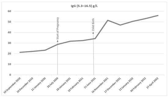 A graph of Serum Monoclonal IgG kappa paraprotein levels from 10 September 2019 (12 months prior to onset of pregnancy) to 27 April 2022 (10 months post-delivery).