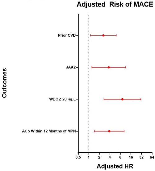 Limitations of our study include its small sample size, single-center, and retrospective nature. Additionally, while the P2Y12 inhibitor and anticoagulation use were captured, the type and dose of the P2Y12 inhibitor and anticoagulant used were not. Patients with MPN are at risk of both cardiovascular and non-cardiovascular etiologies of death, including disease progression. Leukocytosis and JAK2 mutation are two risk factors in our study that are also associated with disease progression in MPNs; thus, it is possible that these risk factors contribute to death or CV events through non-cardiovascular etiologies [18,19]. Additionally, we included all-cause death as part of our outcome of interest, and, therefore, the contribution of JAK2 mutation and WBC on CV-specific death is unclear, given that these variables are also risk factors for non-CV death, including transformation to acute leukemia or myelofibrosis. Our study had too few patients and events to evaluate the role of MPN-specific therapy, including cytoreductive strategies, on outcomes post-ACS. Future studies with larger sample sizes are needed in order to investigate the role of cytoreduction post-ACS in this patient population. However, our findings are hypothesis-generating, which will hopefully spur further investigation in order to improve outcomes in this high-risk population.