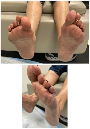 Eight weeks later after restarting the avatrombopag, she developed acute bilateral burning foot pain with attendant acral heat and erythema alternating with polar and vasospasm. Fixed retiform purpura, which was most pronounced along the distal lateral feet, rapidly evolved as well. Figure 1 demonstrates the fixed retiform purpura that was seen and more pronounced along the distal and lateral aspect of the feet. Electromyography and nerve conduction studies were normal. She was evaluated by vascular medicine and was thought to have cutaneous small vessel occlusion/in situ thrombosis with alternating erythromelalgia-like episodes and vasospasm. She had rapid improvement in her manifestations with the avatrombopag dose reduction; hence, her foot pain and acral vasomotor dysfunction were thought to be related to the avatrombopag and it was discontinued. This resulted in the complete resolution of her complaints. She was switched to romiplostim at a dose of 2 mcg/kg subcutaneously weekly and has done well since that time.
