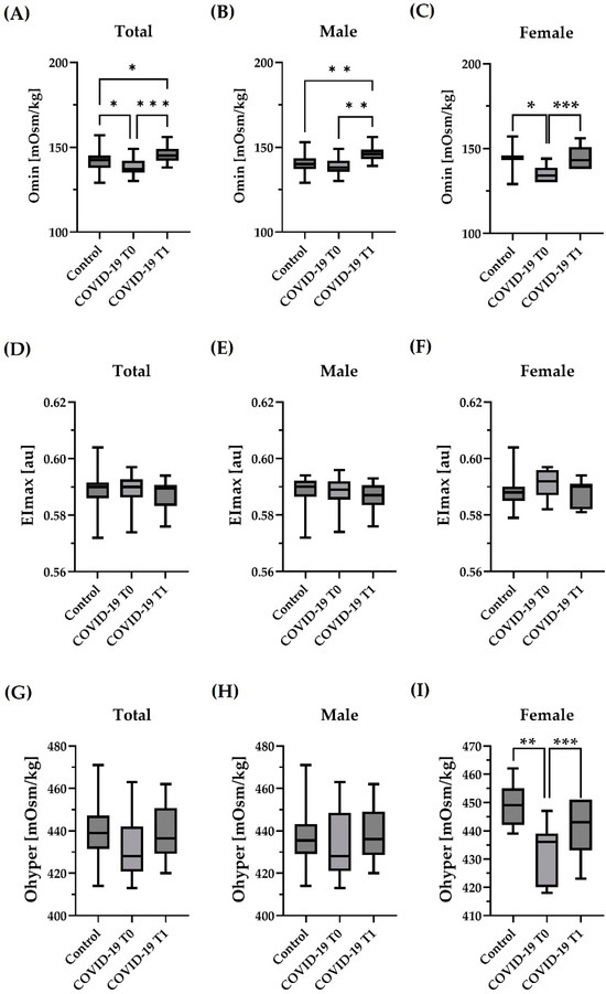 | Parameter | Female Control | Female COVID-19 T0 | Female COVID-19 T1 |