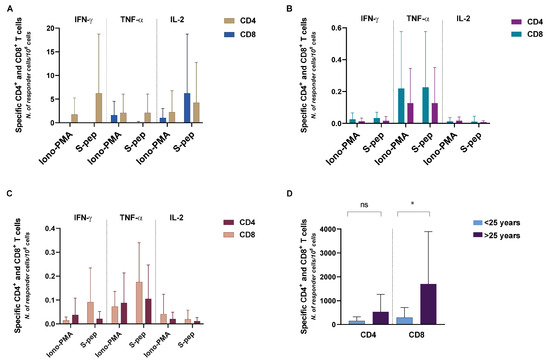 3.2. T-Cell-Mediated Response: Comparison of CD4 and CD8 T Cell Responses and Cytokine Production Assay to SARS-CoV-2 Protein S