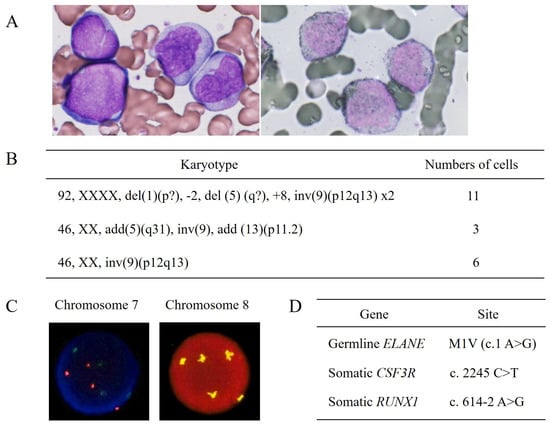 Characteristics of the leukemic blasts at the initial diagnosis of acute myeloid leukemia. (A) Bone marrow aspirate smears displaying blast cells by Wright–Giemsa staining (left, 1000×) and positive myeloperoxidase staining (right, 1000×). The patient was diagnosed with acute myeloid leukemia without maturation according to the WHO classification. (B) Karyotype of 20 cells analyzed by the Giemsa banding technique revealed abnormalities (two different types) in 70% of cells. Inversion of chromosome 9 was considered a normal variant. (C) Fluorescence in situ hybridization (FISH) of chromosome 7 was performed using two probes, namely D7S486 (red) recognizing the 7q31 region and D7Z1 (green) recognizing the centromere region. Excessive and equal numbers of colors were observed in 79% of the bone marrow cells, suggesting an abnormality of chromosome 7 without monosomy 7 (left). FISH of chromosome 8 was performed using D8Z2 probe, which recognizes the centromere region. Pentasomy of chromosome 8 was found in 60% of the bone marrow cells (right). The percentages of karyotypic and FISH abnormalities almost corresponded to those in the blast cells in the bone marrow aspirate smears (A). (D) DNA was extracted from the bone marrow cells and evaluated using a next-generation deep-sequencing assay. Somatic CSF3R and RUNX1 mutations were identified in addition to a germline ELANE mutation.