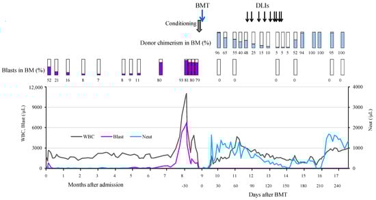 The patient’s clinical course. The clinical course is presented briefly, focusing on the period of spontaneous acute myeloid leukemia remission and BMT. Chimerism was analyzed in all bone marrow cells using DNA microsatellites at the D9S304, D16S3253, and D8S1179 loci (HLA Laboratory, Kyoto, Japan). BM: bone marrow; BMT: bone marrow transplantation; DLI: donor lymphocyte infusion; WBC: white blood cells; Neut: neutrophils.