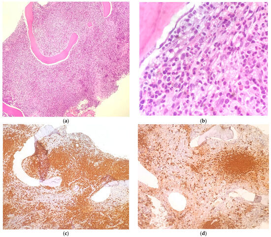 Bone marrow biopsy performed in November 2022 showed extensive bone marrow infiltration by cells with epithelioid and spindle cell morphology ((a,b) H&E staining with 100× and 400× magnification, respectively). Immunostaining for Mast Cell Tryptase was strongly positive in this cell population ((c) 100× magnification). The same immunostaining performed on bone marrow biopsy after 6 months of treatment revealed a consistent reduction in mast cell infiltrate ((d) 100× magnification).