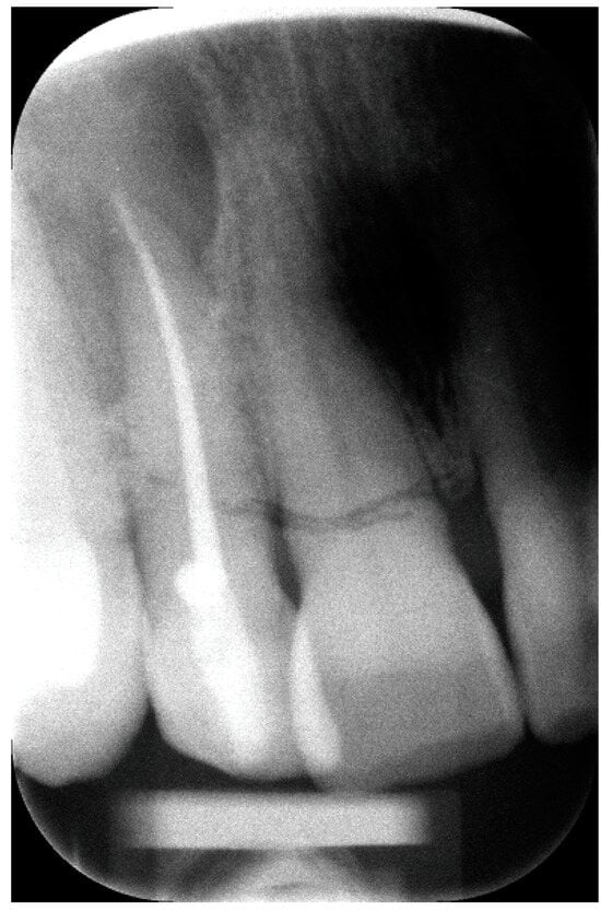 Intraoral Rx showing the lesion around the apical part of the apex of the upper right lateral incisor, after root canal treatment.