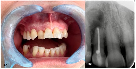 A 3-month follow-up showed the presence of normal soft tissues around the upper lateral incisor (Figure 9A), while intraoral radiography (Figure 9B) demonstrated the bone tissue healing process in progress. The patient is currently undergoing treatment by the hematologist. The hematologist did recommend repetition of the blood and urine tests, with particular attention to the kappa and lambda chains and the free light chain (FLC) ratio, and imaging investigation (Magnetic Resonance Imaging—MRI and Positron Emitting Tomography—PET). The patient, however, still has to undergo a blood test and imaging scans to definitively exclude multiple myeloma and decide on the appropriate strategic therapy.