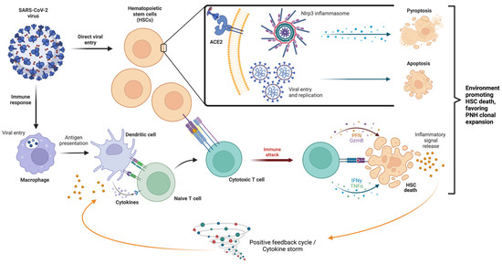 A few mechanisms have been proposed regarding the effect of SARS-CoV-2 on the hematopoietic system including the direct effects of the virus on the bone marrow, cytokine storm causing immune-mediated damage, and the direct effect of virus on erythroid precursors [2]. A summary of these mechanisms is illustrated below in Figure 1. Viral infections, such as SARS-CoV-1, MERS-CoV, and SARS-CoV-2, have been shown to induce a pro-inflammatory state wherein activated white blood cells and cytokines are released in a positive feedback loop [8]. Because of this background inflammatory state, immune system hyperactivation results in multiorgan dysfunction [16]. Ratajczak and Kucia (2020) evaluated the role of the Nlrp3–inflammasome complex in generating an inflammatory microenvironment, how the innate immune system interacts with the inflammasome, and the secretion of pro-inflammatory cytokines in COVID-19 and HSCs (Figure 1) [17]. Their research demonstrated the overexpression of inflammasome complex in HSCs during an active infectious period and that SARS-CoV-2 virus entry receptor angiotensin-converting enzyme 2 (ACE2) is also expressed on the surface of HSCs [17]. They hypothesized that SARS-CoV-2 may be involved in the direct transcription of pro-inflammatory mediators in HSCs by a spike protein interaction with the ACE2 receptor, and it may also induce uncontrolled Nlrp3 inflammasome expression, leading to hematopoietic stem cell death via pyroptosis [17,18].