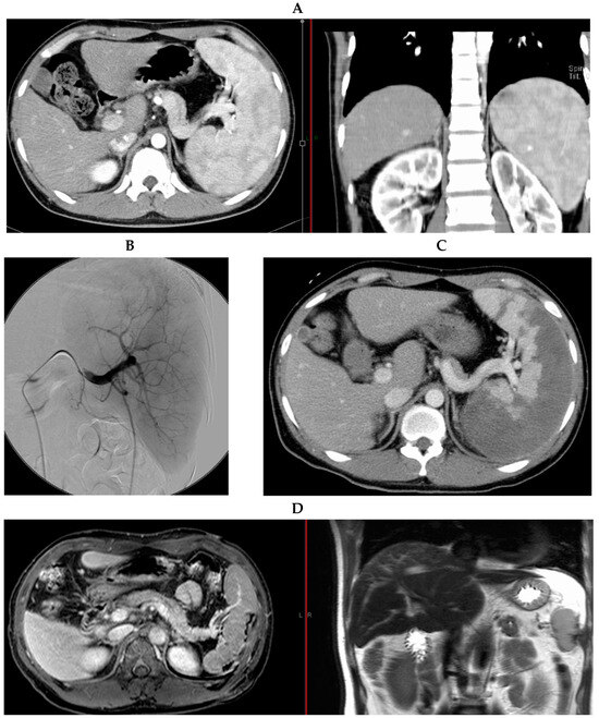 Imaging results for the patient. (A) Contrast-enhanced abdominal CT scan before PSE. The contrast-enhanced abdominal CT scan shows that the spleen is more than 12 cm in size at the coronal section, indicating splenomegaly. (B) Splenic angiography. Splenic angiography was performed to identify the embolized subregions of the spleen. (C) Spleen contrast-enhanced abdominal CT scan. The embolized areas of the spleen after PSE were confirmed with this contrast-enhanced CT scan. (D) Abdominal MRI conducted 5 years after PSE. The MRI was performed to confirm liver tumors 5 years after the PSE. There was no recurrence of splenomegaly.