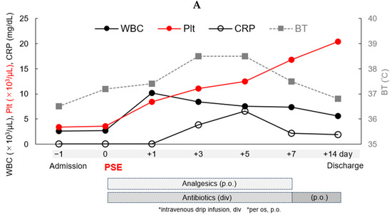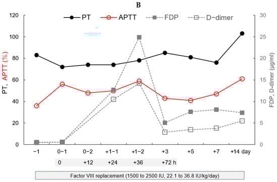 Clinical course of the patient during hospitalization. (A) Time course of the patient’s white blood cell (WBC), platelet (Plt), C-reactive protein (CRP), and body temperature (BT) levels during hospitalization. The time course of the laboratory data is shown for the WBCs in closed circles and a line, for the Plts in red circles and a line, for the CRP in open circles and line, and for the BT in gray squares and a dotted line, all during hospitalization. Analgesics and antibiotics were administered for one and two weeks, respectively, after PSE. (B) Coagulation status of the patient using the prothrombin time (PT), activated partial thrombin time (APTT), fibrin degradation products (FDPs), and D-dimer levels during hospitalization. The time course of the laboratory data is shown for the PT in closed circles and a line, for the APTT in red open circles and a line, for the FDPs in gray squares and a dotted line, and for the D-dimer levels in open squares and a dotted line, all during hospitalization. Adequate FVIII replacement was continued to maintain the APTT between 40 and 60% for 2 weeks during hospitalization.