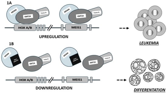 In brief, as shown in Figure 1, the mechanism of action of menin inhibitors is based on the disruption of menin–KMT2A binding, preventing the formation of the specific fusion complex on chromatin, leading to the downregulation of HOX and MEIS1 transcription and inhibition of leukemogenesis.
