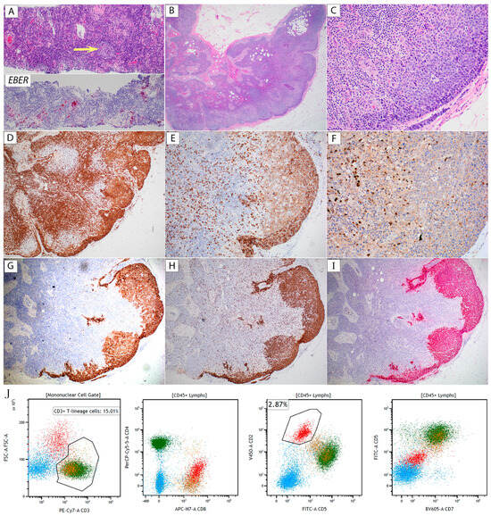 A left axillary lymph node core biopsy was performed and revealed lymphoid tissue with no significant architectural distortion on light microscopy (Figure 1A, upper half). Although not obvious by morphologic examination, immunohistochemical staining revealed a small focus of atypical large cells showing dim CD3 expression and lacking CD5 expression. EBV staining by in situ hybridization of Epstein–Barr virus-encoded small RNAs (EBER) highlighted small aggregates of EBV-positive large cells (Figure 1A, lower half). The focal area of atypical cells was lost in subsequent tissue sections, precluding further characterization. Flow cytometry identified no monotypic B-cell population; the T-cell population could not be evaluated due to low sample cellularity. Excision of the left axillary lymph node was subsequently performed. Large atypical cells were focally present in the subcapsular area on the hematoxylin and eosin (H&E)-stained sections (Figure 1B,C). Immunohistochemical staining (Figure 1D–G) showed that these cells were positive for CD2, CD3, CD8, CD30, TCRβ, GATA-3, partial CD15 (small subset), and TIA-1 (few cells), and had a high Ki-67 proliferation rate approaching 100% (Figure 1H). Large atypical cells were diffusely and strongly positive for EBER (Figure 1I). These cells were negative for CD4, CD5, CD7, CD56, TCRγ, PD1, and ALK1. Flow cytometric immunophenotyping revealed a distinct cell population with high forward light scatter that expressed CD2 (bright), CD3 (dim), CD8, CD15, CD45, and dim to negative CD5 and CD7. This population displayed no expression of CD4, CD26, or CD56 (representative dot plots are shown in Figure 1J). No neoplastic lymphocytes were detected in the peripheral blood by morphologic examination of a blood smear or by flow cytometry. EBV DNA, detected by quantitative polymerase chain reaction (PCR), was 91,500 IU/mL (reference range: 0–299).