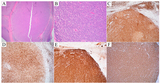 A 56-year-old male presented with persistent parotid and groin lymphadenopathy, fatigue, and night sweats, but denied fever, chills, or weight loss. CT imaging revealed an enlarged left inguinal lymph node measuring 3.2 × 3.1 cm, along with small lymph nodes in the suprainguinal region. PET-CT identified metabolic activity in the left neck with an SUV of 5.9, corresponding to an intraparotid lymph node measuring 1.9 × 1.9 cm. An inguinal lymph node excision was performed. H&E-stained sections of the lymph node showed near-complete effacement of the architecture by a nodular proliferation of large, pleomorphic lymphoid cells with prominent nucleoli and high mitotic activity (Figure 2A,B). Immunohistochemistry demonstrated positive staining for CD2, CD3 (Figure 2C), CD7 (weak, subset), CD8 (dim, Figure 2D), and CD30 (strong and diffuse, Figure 2E), while it was negative for CD4, CD5, CD20, CD25, CD56, ALK, and perforin. The Ki-67 proliferation index was high (90–100%, Figure 2F). An in situ hybridization of Epstein–Barr virus (EBER) was negative. Flow cytometric analysis confirmed the presence of an aberrant T-cell population expressing CD45, CD3 (decreased intensity), CD2 (increased intensity), and TCRαβ. Fluorescent in situ hybridization (FISH) identified no ALK or P63 rearrangements and was inconclusive for DUSP22 rearrangement. The patient was diagnosed with ALK-negative ALCL and received brentuximab vedotin in combination with CHP chemotherapy, with symptomatic improvement and resolution of the parotid lymph node. He subsequently received autologous hematopoietic stem cell transplantation and remained in complete remission 5 months after transplantation.