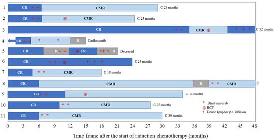 Eleven patients received blinatumomab between July 2021 and December 2022, intending to achieve sustained MRD negativity. Patients received blinatumomab via continuous IV infusions at a flat dose of 15 µg/m2/day. At the time of blinatumomab treatment, the study population had a median age of 11.5 years (range 3–19 years), and a wide range of cytogenetic abnormalities were observed in the cohort (Table 1). Figure 1 displays the therapy responses and outcomes for each patient.