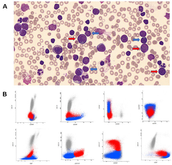 Peripheral blood leukocytosis with left shift and blasts of different sizes (blue arrows indicate immature T-lymphoid cells and red arrows indicate immature myeloid cells) (May–Grünwald Giemsa stain, ×100) (A). Representative flow cytometry dot plot graphs showing two abnormal populations: one characterized by immature T-lymphoid phenotype (CD34+, TdT+, cyCD3+, sCD3−) in blue and one with characteristics of immature myeloid phenotype (CD117+, CD33+) and CD7 aberrant expression in red (B).