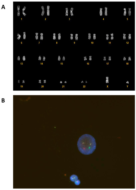 G-banded karyotype on cells from a BM sample with the classic Philadelphia translocation t(9; 22)(q34; q11) (A). Fluorescence in situ hybridization (FISH) showed BCR:ABL1 fusion on interphase nuclei with a dual fusion translocation probe (B).