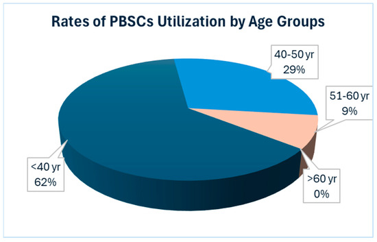 Showing the rates of utilization of stored PBSCs according to age group. The data reveals a higher utilization rate among younger patients, with the highest rate observed in the age group under 40 years. Conversely, there is no utilization of stored PBSCs for salvage ASCT in patients over 60 years old. Abbreviation: PBSCs = Peripheral blood stem cells.