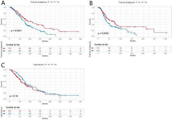 Figure 1. (A) Overall survival (OS) in newly diagnosed multiple myeloma patients (n = 345) with fracture at diagnosis (n = 158) was inferior compared to ones without fracture (n = 172, p = 0.0041). (B) Progression-free survival (PFS) was inferior in patients with fracture at diagnosis (p = 0.0055). (C) Later fracture had no effect on OS (p = 0.16).