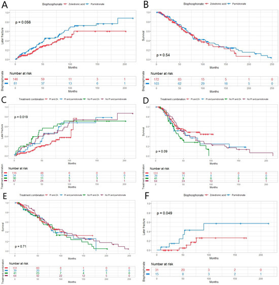 Figure 3. (A) There was almost a statistically significant difference between the two bisphosphonates zoledronic acid (ZA) and pamidronate and their effect on later fracture in this newly diagnosed multiple myeloma (MM) patient population (p = 0.056), and (B) in life expectancy between the bisphosphonates (p = 0.54). (C) The time to next fracture was longer in patients receiving proteasome inhibitor (PI)-containing treatment combined with ZA (p = 0.019). (D) There was no effect on progression-free (p = 0.09) or (E) overall survival between different treatment combinations in the same patient group (p = 0.71). (F) Within patients who did not have MM-related bone disease at diagnosis, there was a statistically significant difference between two bisphosphonates and their effect on later fracture (p = 0.049).