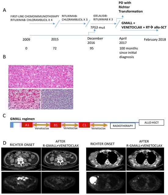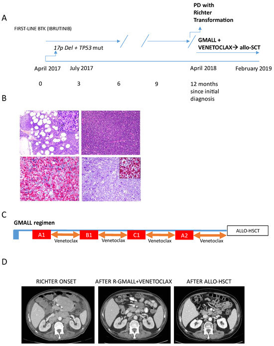 After a short wait-and-see period, the patient received first-line Ibrutinib. However, after one year, in May 2018, the patient complained of a nreappearance of B symptoms (fever, weight loss), associated with significant enlargement of cervical adenopathies (Figure 1A). The laboratory showed increased serum lactate dehydrogenase (LDH) levels. Suspecting histological transformation, a lymph node biopsy was performed, confirming the diagnosis of RS (Figure 1B), which was clonally related to the original CLL, as determined by an analysis of the immunoglobulin heavy chain Ig VDJ genes. A bone marrow biopsy showed CLL infiltration and evidence of a hemophagocytic syndrome. At this point, due to the rapid clinical deterioration, a combined treatment of venetoclax plus chemoimmunotherapy with the R-GMALL regimen was started. Venetoclax was given for 14 consecutive days, starting from the next day after each chemotherapy course until the day before the next chemotherapy cycle, with G-CSF support. An accelerated venetoclax ramp-up schedule (100 mg day 1, 200 mg day 2, 300 mg day 3) was used at first cycle (A1). (Figure 1C). After the first R-GMALL plus venetoclax course, the clinical conditions improved rapidly, with disappearance of fever and reduction in lymphadenopathies confirmed by an ecotomography scan. The patient was then treated with three additional courses of R-GMALL regimen (B1, C1, A2). There was a ten-day therapy delay at cycle 4 due to delayed hematologic recovery. A CT (represented in Figure 1D) and an FDG-PET scan performed after the fourth cycle showed a complete remission. Minimal residual disease (MRD) evaluation in the peripheral blood by flow cytometry was negative (<10−4). Given the achievement of complete remission, the patient underwent allo-HSCT with a haplo-identical related donor, according to the original Baltimore schedule [18] (Cy 14.5 mg/kg/day i.v. on days −6 and −5, fludarabine 30 mg/m2/day i.v. on days −6 to −2, and 200 cGy of TBI on day −1 with 50 mg/kg Cy administered on days +3 and +4). The transplant procedure was well tolerated, with no major complications. A CT scan performed 3 and 6 months after allo-HSCT demonstrated further reduction in residual abdominal masses (Figure 1D). After 60 months from allo-HSCT, the patient is alive and in continuous complete remission.