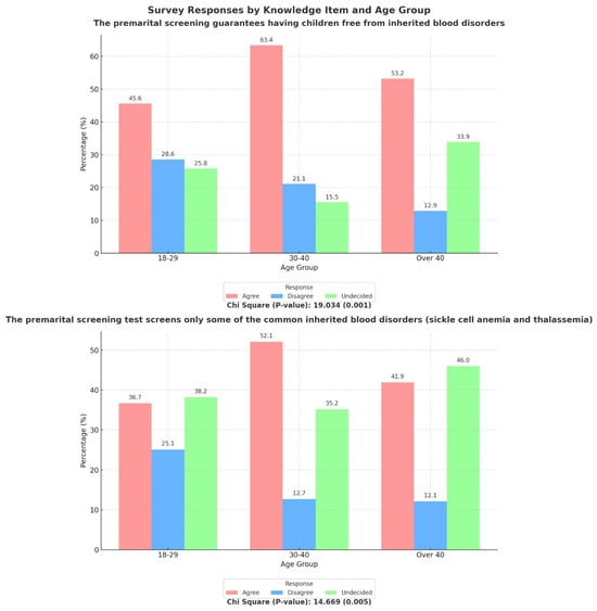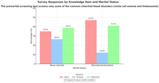 The knowledge of participants regarding PMS was assessed by several questions listed in Supplementary Table S2 and its association with various sociodemographic determinants is illustrated in Table 2 and Table 3 and Figure 1 and Figure 2. Nearly half of the study population (50.2%) agreed that premarital screening ensures that children are free of inherited blood disorders. The majority of the participants (40.4%) agreed that PMS test screens only some of the common inherited blood disorders (sickle cell anemia and thalassemia), but almost equal number (39.7%) of respondents were not aware about it. This agreement was significantly associated with the age group (p = 0.005) of participants and their marital status (p < 0.001), where people in the age range of 30–40 years and who were married/married before had greater knowledge (Figure 1 and Figure 2). The study population was also aware (79.3%) of the fact that consanguinity can raise the risk of inherited blood diseases in children. Females (p = 0.002) and people with university degrees (p = 0.010) showed significant awareness as compared to the others (Table 2 and Table 3). When asked about their knowledge of disease transmission, more than half of the respondents (69.9%) were convinced that if both parents are carriers for the same genetic blood disease, there will be a risk of having a child affected with this disorder. Higher education level (p = 0.007) and female gender (p = 0.009) were found to be significantly associated with the knowledge about disease transmission (Table 2 and Table 3). The majority of the participants (56.5%) were also aware that, if the couples were both carriers of a specific genetic blood disorder, there is a procedure called pre-implantation genetic testing that can be considered instead of separation. This awareness was significantly correlated with gender (p = 0.018), where females were more aware than males (Table 2).
