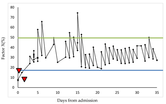 Trends in FX activity throughout hospital admission. Showing factor X level (%) at different time points during admission, pre- and post-FX concentrate treatment. FX concentrate was initially dosed at [body weight × desired factor 10 rise × 0.5]. Doses were increased by 100% until the desired factor X levels were achieved. Maintaining peak and trough factor X levels above 20% (blue line) resulted in significant improvement in bleeding episodes (denoted by red triangles). A threshold of 50% was used to facilitate interventions (green line), with no post-procedural haemorrhage reported.