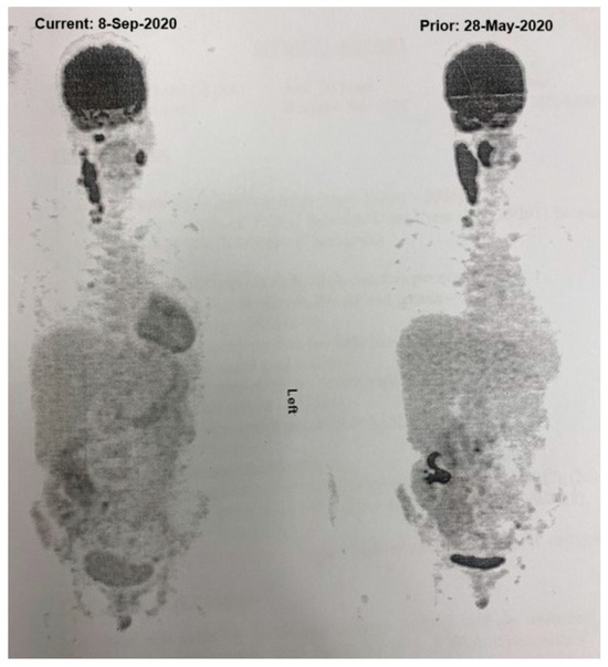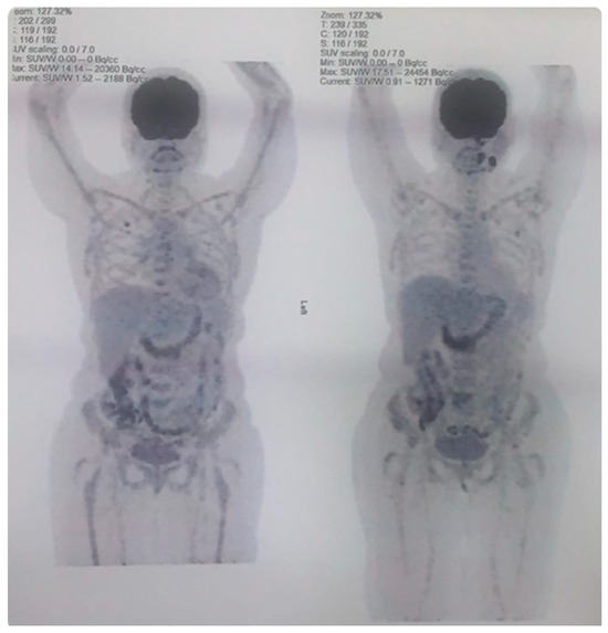 In March 2024, the patient experienced another relapse, presenting with left cervical lymphadenopathy and tonsillar involvement. Epstein–Barr virus (EBV) testing was not performed at the time of relapse as the test was unavailable. A PET scan showed hypermetabolic lesions with Focal 18 F-fluorodeoxyglucose (FDG) uptake in the scapula and iliac bone. A biopsy confirmed high-grade non-Hodgkin lymphoma. The MDT recommended initiating loncastuximab tesirine due to poor renal function (serum creatinine 633 µmol/L, eGFR < 10 mL/min/1.73 m2). The patient received four cycles of loncastuximab tesirine, with a dosing regimen consisted of 0.15 mg/kg for the first two cycles, followed by 0.075 mg/kg for subsequent cycles. In October 2024, the patient achieved a metabolic response as evidenced by an interim PET scan. She has since received a fifth cycle and remains under close observation (Figure 2).