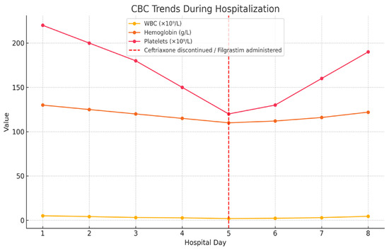 Ceftriaxone was discontinued, and filgrastim was administered subcutaneously at a dose of 30 MU (approximately 300 mcg) on day 5 of hospitalization. According to the medication administration chart, only a single dose of filgrastim was given. Trends in hematologic parameters throughout hospitalization are shown in Figure 1.