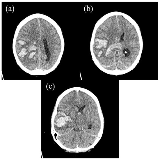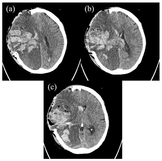 (a–c) The postoperative axial cranial CT scan revealing further ICH in the right frontal and parietal lobes.