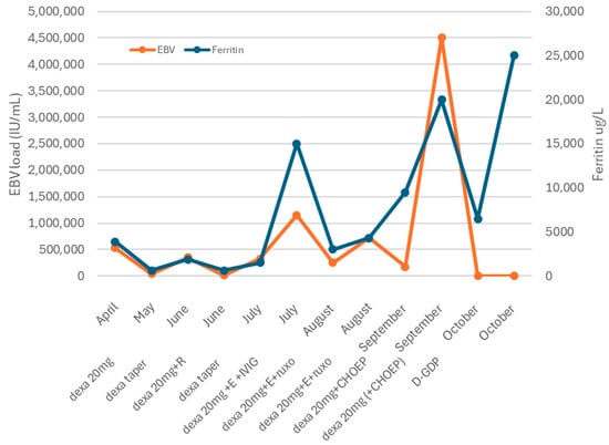 This 32-year-old man presented with HLH and high EBV load. At this point, there are several etiologies to be considered. Although primary EBV infection can induce HLH [1], the positive EBV IgG suggested this was not the case. EBV reactivation in primary immunodeficiencies—such as interleukin-2-inducible t-cell kinase (ITK) deficiency, autoimmune lymphoproliferative syndrome (ALPS), and X-linked lymphoproliferative disease (XLP) [2,3]—remains possible, given their association with EBV-related HLH. Chronic active EBV infection (CAEBV), defined by persistent EBV viremia > 3 months, organ involvement, and EBV-positive T or NK cells without known immunodeficiency or malignancy [4] and also EBV-positive lymphoma (NK/T-cell, B-cell, or Hodgkin lymphoma) should also be considered. Aggressive NK-cell leukemia, typically EBV-associated, seemed unlikely as the bone marrow showed no malignant infiltration. Finally, EBV might act as a non-specific HLH trigger, either in familial HLH or critical illness.