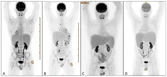 PET scans during clinical course. (A) PET-CT showing splenomegaly without increased FDG-uptake. (B) PET-CT showing additional mesenterial lymphadenopathy, FDG-avid splenic nodules, and bone lesions. (C) PET-CT showing normalization of FDG-avid lymphadenopathy and splenomegaly without increased FDG uptake. (D) PET-CT showing increased splenomegaly with increased FDG uptake. PET = positron emission tomography. FDG = 18fluorodeoxyglucose.