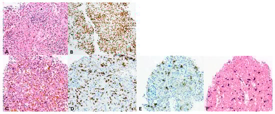 During a subsequent HLH flare, PET-CT revealed progressive splenomegaly with increased FDG uptake (Figure 3D). A third splenic biopsy showed an atypical infiltrate of small and scattered larger cells with irregular nuclei. The cells were positive for CD2, CD3, CD56, granzyme B, TIA1, and EBER; CD56/EBER double staining confirmed the atypical population. CD30 was weakly positive (1–5%). p53 showed nuclear overexpression with high proliferative activity (75%). CD5, CD7, CD8, MUM1, TCRab, TCR-delta, TdT, and CD20 were negative. No clonal T-cell population was detected. The findings support EBV-positive extranodal NK/T-cell lymphoma (Figure 4C–F). The patient was treated with D-GDP (cisplatin, dexamethasone, gemcitabine, and peg-asparaginase) [5], resulting in clinical improvement and a reduction in EBV load and ferritin levels. Ruxolitinib and dexamethasone were tapered.