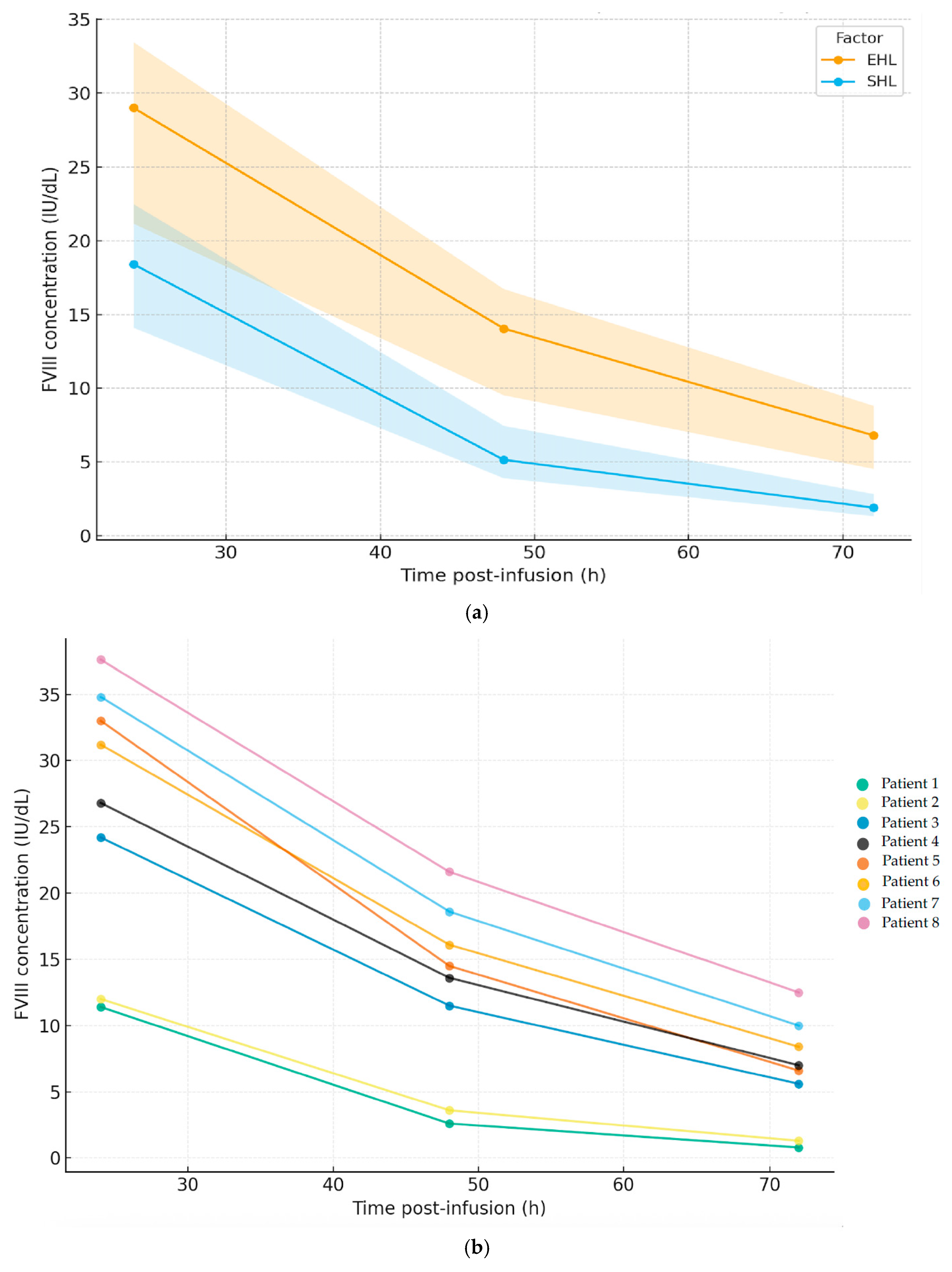 The PK and clinical variables analyzed were: t1/2; AUC; peak level (PL); FVIII concentration at 24, 48, and 72 h (C24/C48/C72); time to reach FVIII levels of 5%, 2%, and 1% (T5%/T2%/T1%, representing the time elapsed after infusion until plasma FVIII activity falls below a specific threshold); and target trough level (TL, the minimum plasma FVIII concentration aimed to be maintained immediately before the next infusion, as the therapeutic goal was to ensure continuous hemostatic protection). The AUC was obtained from data provided by McMaster University. All PK parameters were calculated using the WAPPS-Hemo® application, which employed the application’s clinical calculator to obtain PL, C24/C48/C72, and TL from the individualized PK profiles. The t1/2 and AUC ratios were calculated, and incremental recovery (IR) was determined for both SHL and EHL concentrates in each patient as the ratio of the difference between FVIII plasma concentration (peak level–trough level), divided by the infused dose (IU/kg).