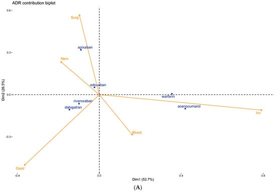(A) Contribution biplot showing the determinant role of ADRs in separating the safety profiles of OACs. (B) Contribution biplot showing the determinant role of fatal ADRs in separating the safety profiles of OACs.