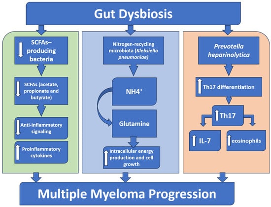 A schematic diagram showing the role of gut microbiota in multiple myeloma progression. Gut dysbiosis results in a reduced abundance of the beneficial short-chain fatty acids (SCFAs)-producing bacteria, which leads to a decrease in the anti-inflammatory SCFAs, permitting an overactivation of inflammatory signaling. Simultaneously, an increase in nitrogen-recycling bacteria (e.g., Klebsiella pneumoniae) increases glutamine synthesis that boosts the intracellular energy and tumor growth. Furthermore, a specific bacterium like Prevotella heparinolytica supports the intestinal Th17 cell differentiation and migration to the bone marrow, where they generate IL-17, stimulate eosinophils, and trigger additional IL-6 release. Together, these pathways all lead to the progression of multiple myeloma.