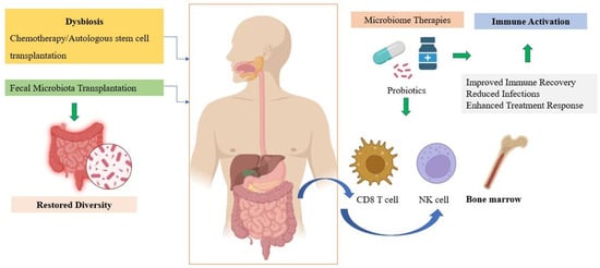 In addition, microbiome-based biomarkers are being developed to predict treatment outcomes. For example, low alpha diversity and abundance of Proteobacteria were associated with increased risk of bloodstream infections post-ASCT in MM patients []. Early identification of such high-risk profiles could allow for proactive microbiome modulation.