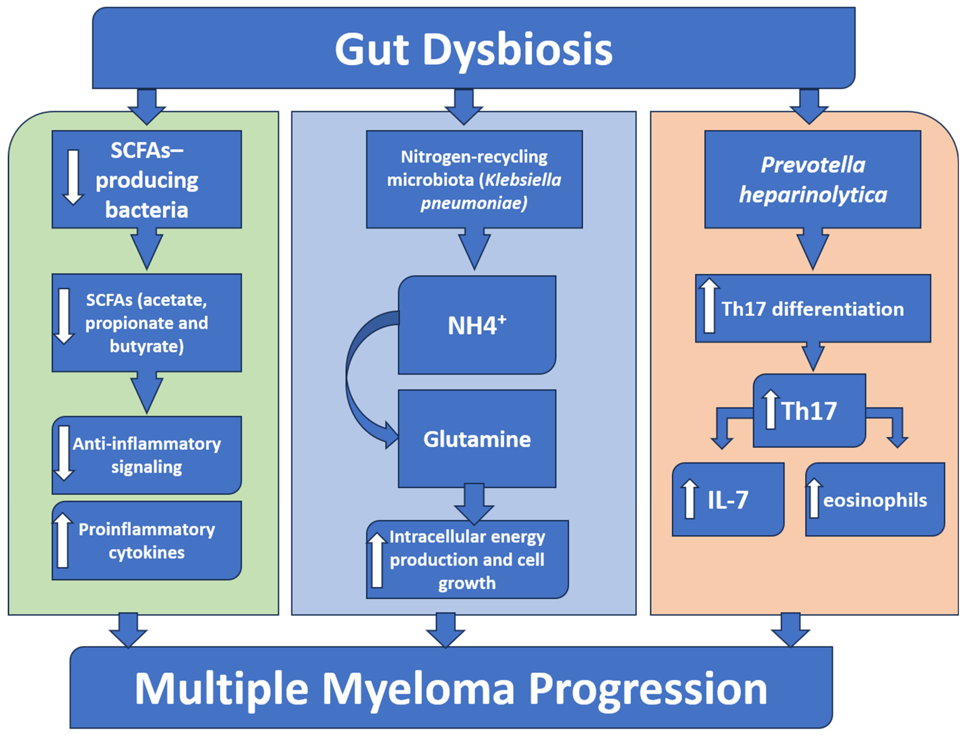 Figure 2. A schematic diagram showing the role of gut microbiota in multiple myeloma progression. Gut dysbiosis results in a reduced abundance of the beneficial short-chain fatty acids (SCFAs)-producing bacteria, which leads to a decrease in the anti-inflammatory SCFAs, permitting an overactivation of inflammatory signaling. Simultaneously, an increase in nitrogen-recycling bacteria (e.g., Klebsiella pneumoniae) increases glutamine synthesis that boosts the intracellular energy and tumor growth. Furthermore, a specific bacterium like Prevotella heparinolytica supports the intestinal Th17 cell differentiation and migration to the bone marrow, where they generate IL-17, stimulate eosinophils, and trigger additional IL-6 release. Together, these pathways all lead to the progression of multiple myeloma.