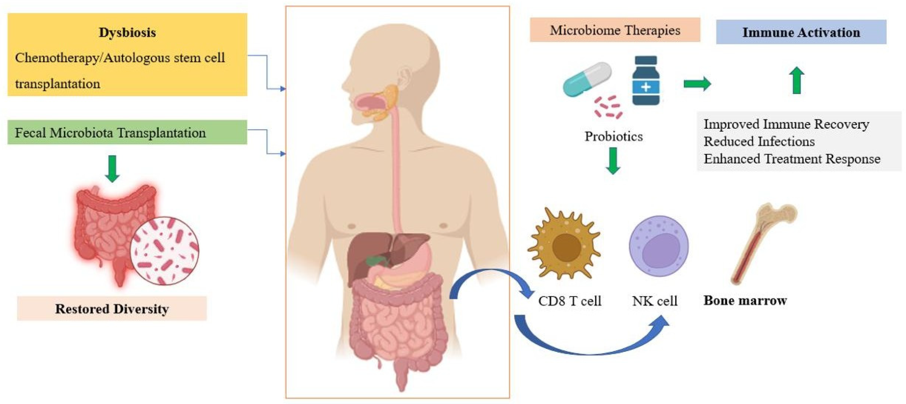 In MM, the gut microbiome is significantly disrupted following high-dose chemotherapy and autologous stem cell transplantation (ASCT) [20]. Dysbiosis in this context is linked with increased risk of bloodstream infections, mucosal barrier injury, and impaired immune reconstitution [91]. Preclinical and early clinical observations suggest that beneficial taxa such as Eubacterium hallii and Faecalibacterium prausnitzii enhance short-chain fatty acid (SCFA) production, promote immune regulation, and support T-cell and natural killer (NK) cell activation, thereby strengthening anti-myeloma immunity. Additionally, preclinical models suggest that FMT can restore microbial diversity and enhance CD8+ T cell function, leading to improved tumor control [93,94]. A study by Daillère et al. demonstrated that the efficacy of cyclophosphamide in MM-bearing mice was partially dependent on gut microbiota, particularly Enterococcus hirae and Barnesiella intestinihominis, which promoted immune-mediated tumor regression [95]. In another study, germ-free or antibiotic-treated mice showed inferior responses to immunotherapy unless they received FMT from responder patients [96]. These results support the immunomodulatory potential of FMT in MM.