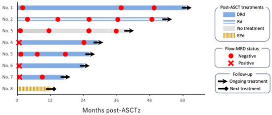 Swimmer plot showing post-ASCT clinical course in eight patients. “No.” denotes the patient number, and they are listed in order by the duration of post-autologous stem cell transplantation (ASCT) treatment. Four patients achieved flow cytometry-assessed measurable residual disease (flow-MRD) negative status directly after ASCT. Two additional patients achieved flow-MRD negative status following post-ASCT treatment with daratumumab, lenalidomide, and dexamethasone (DRd). Only one patient, who received elotuzumab, pomalidomide, and dexamethasone (EPd), proceeded to the next treatment due to disease progression.