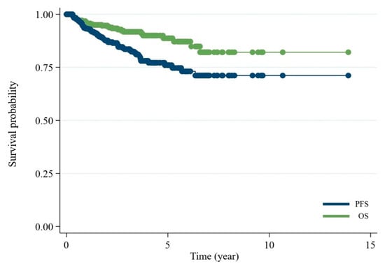 Kaplan–Meier curves showing overall survival (OS) and progression-free survival (PFS) for all patients in the cohort. The 5-year PFS was 76.4% and 5-year OS was 89.3%.
