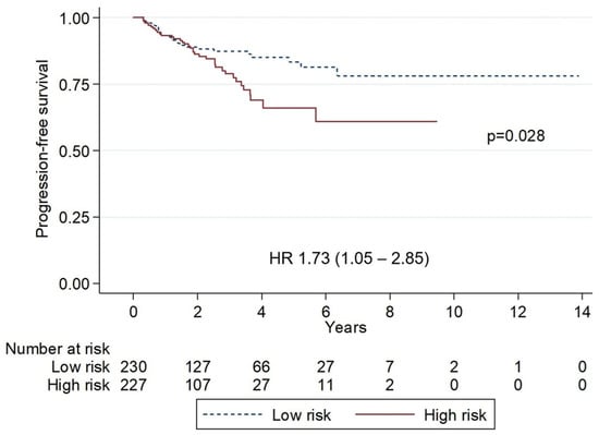 Kaplan–Meier curves of progression-free survival stratified by risk groups. The low-risk group showed superior survival, 5-year progression-free survival 83.3% vs. 58.7% (p = 0.028). HR, hazard ratio.