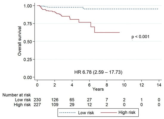 Kaplan–Meier curves of overall survival stratified by risk groups. The low-risk group showed superior survival, 5-year progression-free survival 97.8% vs. 72.7% (p < 0.001).