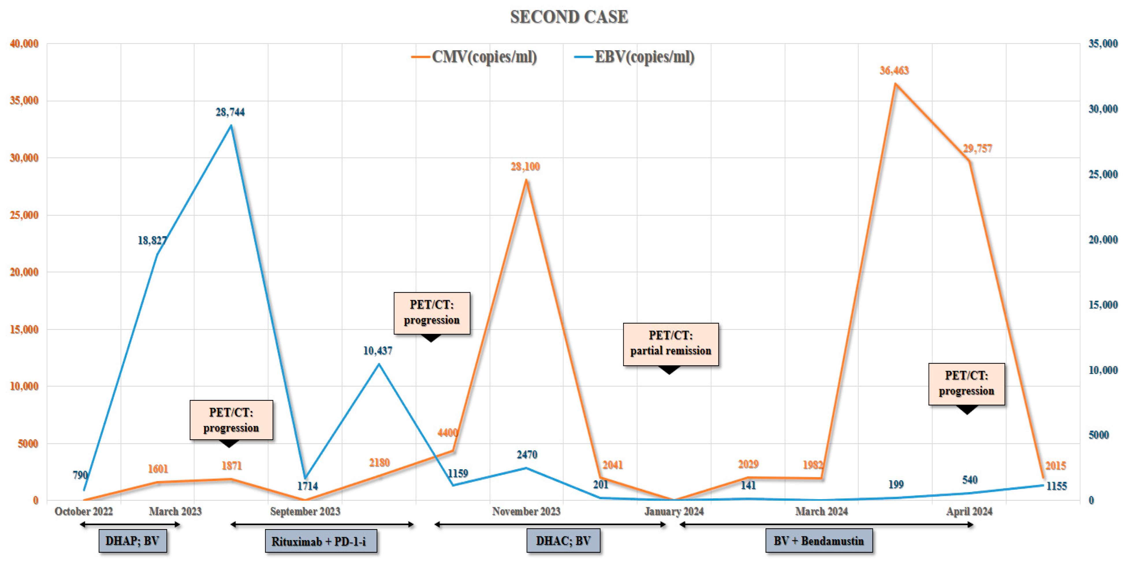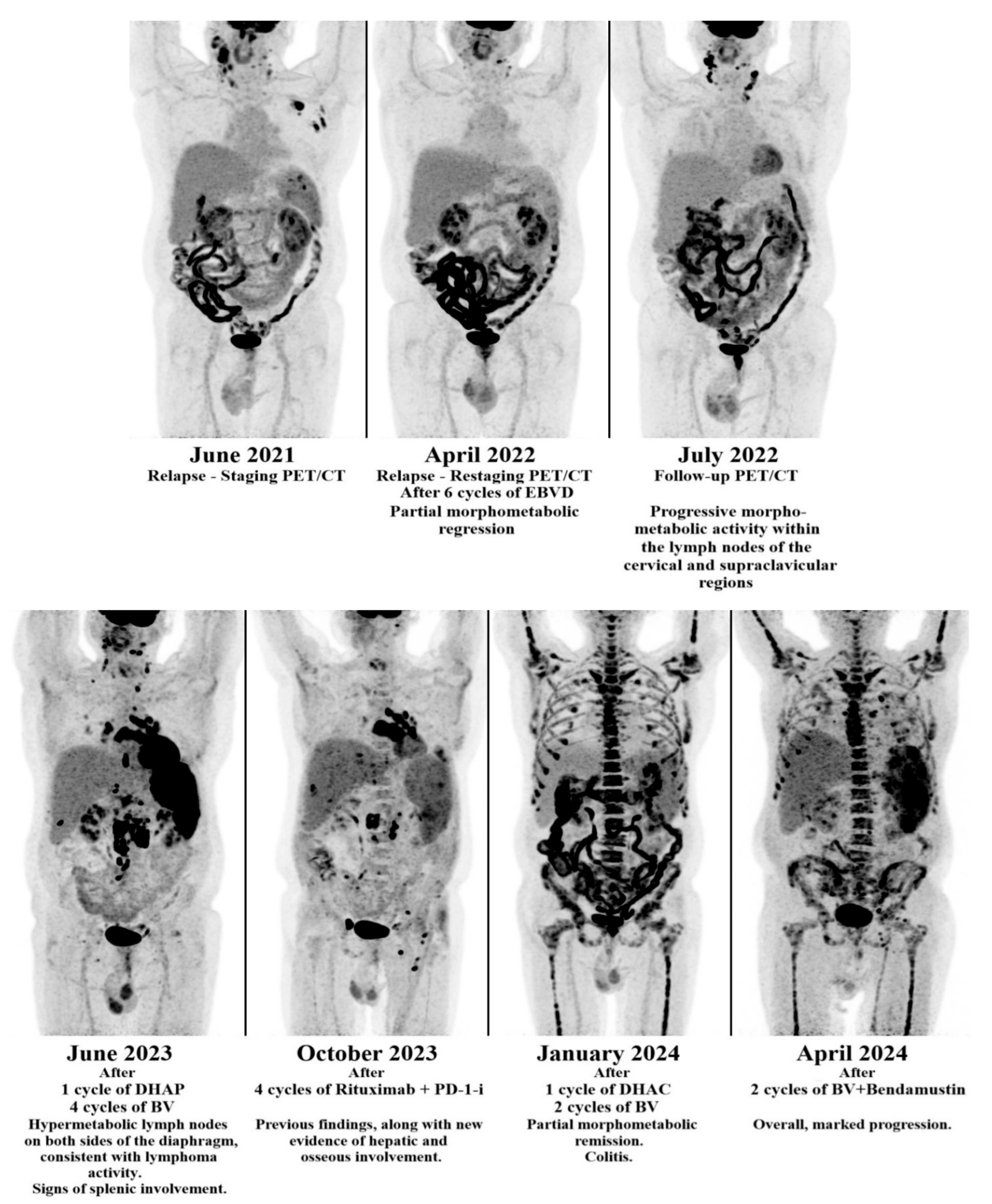 | Case 2 (Own) | 56 | EBVD → DHAP → BV →PD-1-i + Rituximab → DHAC → BV + Bendamustine → Death | Positive |