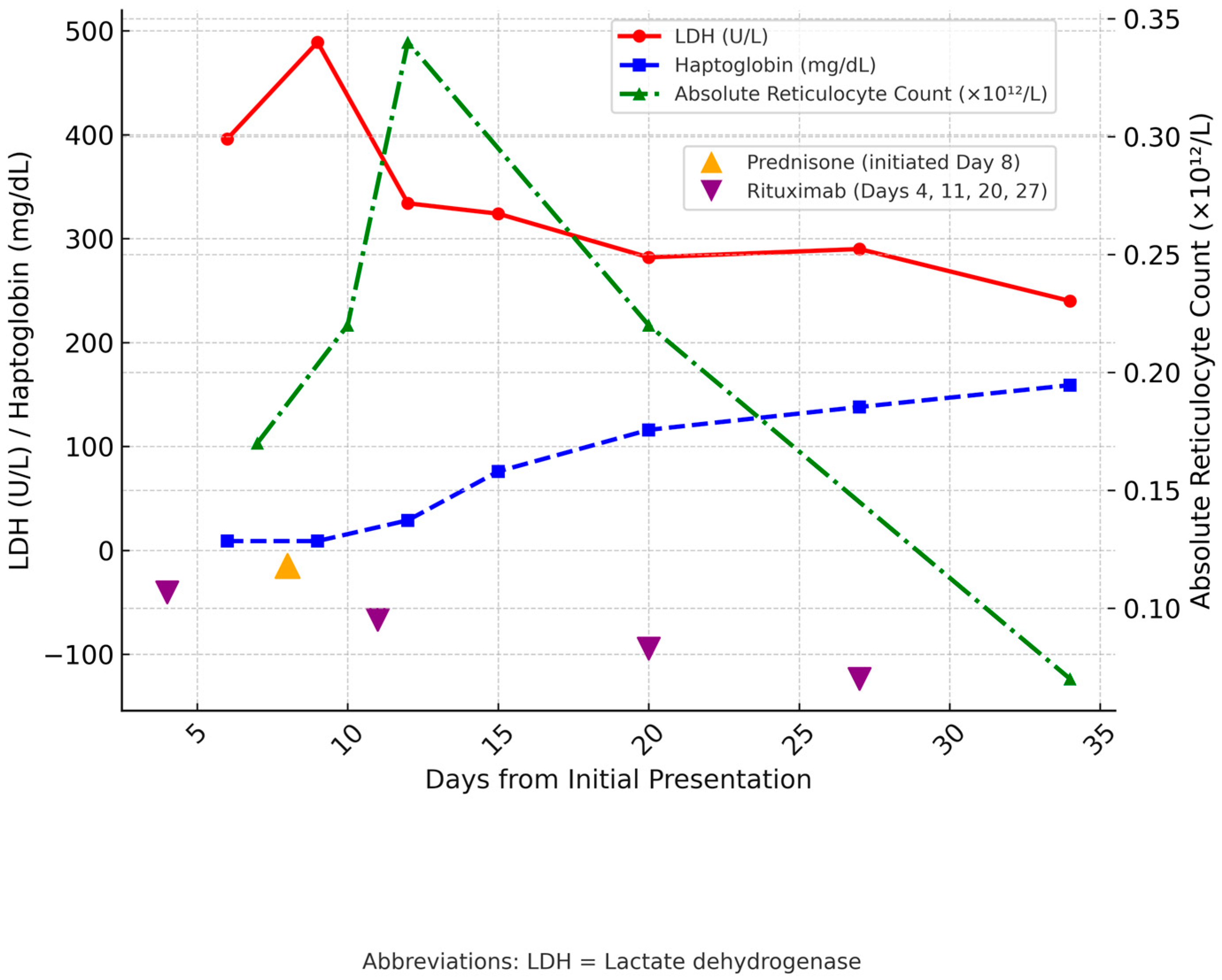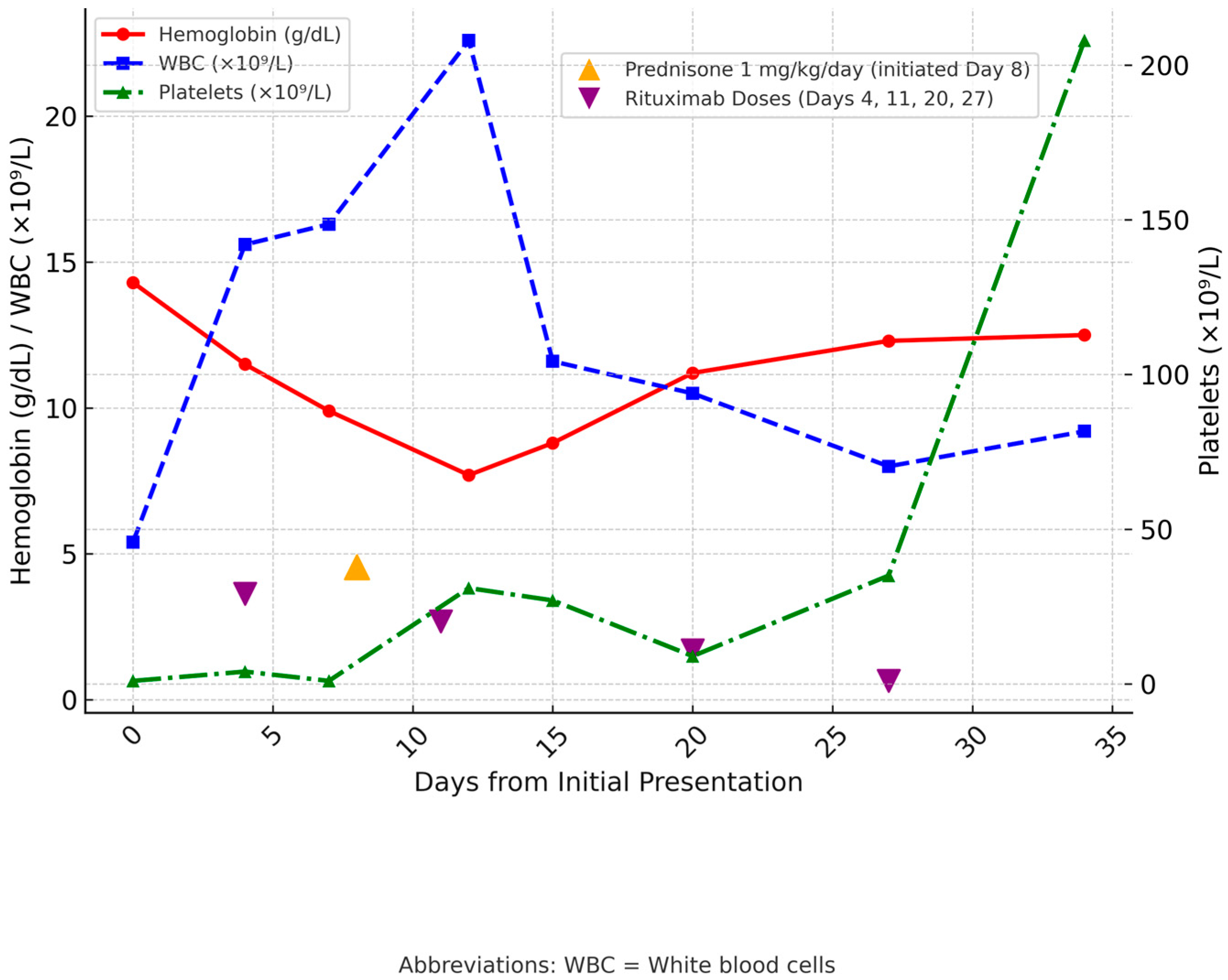 | Day 11 | Ongoing anemia and low platelets | Platelets 16 × 109/L, Hb 7.9 g/dL | 2nd Rituximab dose administered |