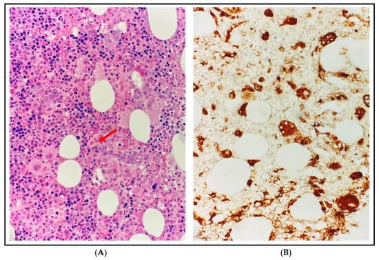 Bone marrow biopsy at diagnosis. (A) Dominici stain at 500× magnification: diffuse infiltration of activated histiocytes with vacuolization and phagocytosis of blood cells, particularly erythrocytes and granulocytes, consistent with hemophagocytic lymphohistiocytosis (HLH), without other proliferative disorders; the red arrow indicates an activated histiocyte engulfing 3 erythrocytes. (B) CD68-PGM1 immunohistochemistry at 500× magnification: histiocytes are highlighted in brown while the phagocytosed erythrocytes appear as CD68-negative elements within their cytoplasm.
