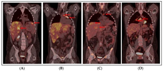 PET/CT scan at diagnosis: red arrows show extensive liver (SUV max 7.1) and splenic (SUV max 7) hypermetabolism (A) and lymphadenopathies in the left pre-tracheal (SUV max 8.5), pre-vascular (SUV max 8), and anterior mediastinal (SUV max 11.9) regions (B). (C) PET/CT scan after 3 cycles of ICE-21, before allo-HSCT: PMR with complete resolution of splenic hypermetabolic sites and mild reduction in mediastinal mass (32 mm, SUV max 4.6) and paratracheal and pre-vascular hypermetabolism (red arrow, SUV max 4.8), with persistent diffuse hepatic hypermetabolism (more pronounced in segments 4 and 7, as highlighted by red arrows, SUV max 4.8) in the context of hepatomegaly. (D) PET/CT scan 18 months after allo-HSCT: red arrows show an increase in the mediastinal mass (40 × 30 mm, SUV max 4.5) with the appearance of new hypermetabolism in the right paratracheal (SUV max 6.5), pre-carinal (SUV max 5.4), and sub-carinal (SUV max 7.2) regions and right hilar pulmonary (SUV max 6) lymphadenopathy, consistent with IPEH. Abbreviations: PET/CT: Positron Emission Tomography/Computerized Tomography, SUV: Standardized Uptake Value, ICE-21: Ifosfamide–Carboplatin–Etoposide, allo-HSCT: Allogeneic Hematopoietic Stem Cell Transplantation, PMR: Partial Metabolic Response, IPEH: Intravascular Papillary Endothelial Hyperplasia.