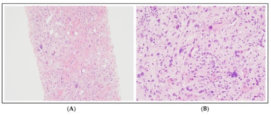 Liver biopsy at diagnosis: hematoxylin and eosin staining at 100× magnification (A) and 200× magnification (B). These histological images illustrate atypical cells with weakly eosinophilic cytoplasm and heterogeneous nuclei in shape and size, ranging from medium-sized oval or spindle-shaped elements to cells with very large and pleomorphic nuclei, and some multinucleated cells, with vesicular chromatin and prominent nucleoli.