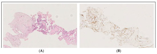 Masson’s tumor/intravascular papillary endothelial hyperplasia (IPEH): the image with hematoxylin–eosin staining at 150× magnification (A) shows a fibrous tissue biopsy, including a dilated vessel containing a papillary proliferation of plump endothelial cells without atypia, while anti-CD31 immunohistochemistry at 100× magnification (B) shows the expression of CD31, demonstrating the vascular origin.
