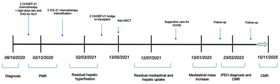 Timeline of clinical findings. Abbreviations: CHOEP-21: cyclophosphamide, doxorubicin, etoposide, vincristine; IVIG: intravenous immunoglobulin; HLH: hemophagocytic lymphohistiocytosis; ICE: ifosfamide–carboplatin–etoposide; allo-HSCT: allogeneic hematopoietic stem cell transplantation; GVHD: graft-versus-host disease; PMR: partial metabolic response; IPEH: intravascular papillary endothelial hyperplasia; CMR: complete metabolic response.