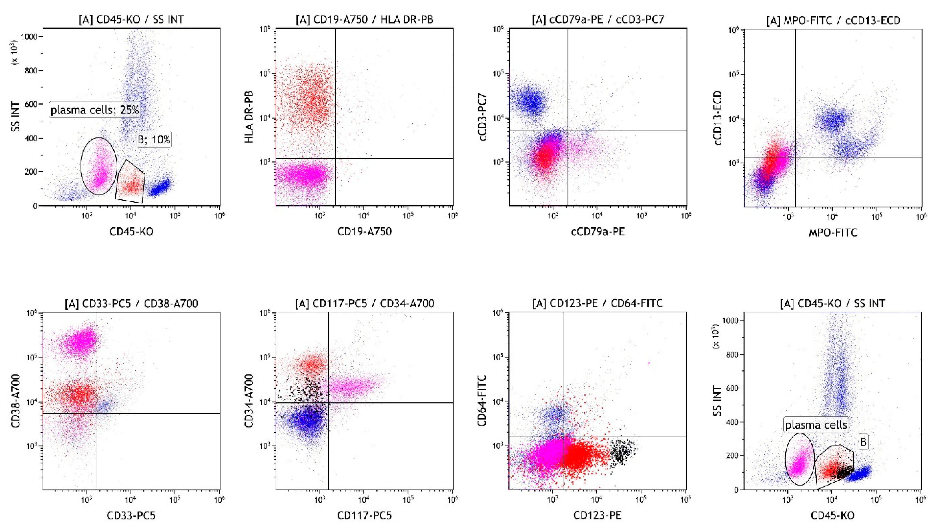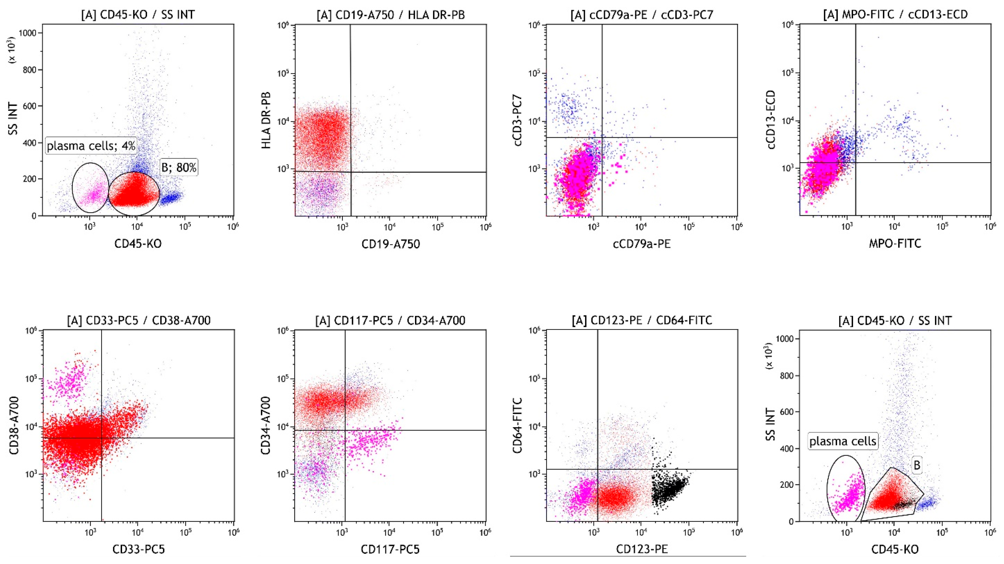 Bone marrow biopsy confirmed the presence of two populations: 50–60% atypical plasma cells with aberrant expression of CD117 and Cyclin D1, and no light chain restriction, and 40% CD34/TdT/CD99-positive cells, which were not clearly specified and could also represent acute leukemia. The patient was asymptomatic, with normal calcium levels and renal function, and no lytic lesions or extramedullary infiltrates detected on PET-CT. Flow cytometric analysis was performed in the bone marrow sample. Briefly, the sample was subjected to erythrocyte lysis with ammonium chloride. After lysis, the cells were washed twice with phosphate-buffered saline. The cells were incubated with monoclonal antibodies (Beckman Coulter, Brea, CA, USA). After incubation, the acquisition on the flow cytometer (Navios, Beckman Coulter, Brea, CA, USA) was performed. The optical alignment and fluidic system were checked daily prior to sample acquisition using Flow-Check Pro Fluorospheres (Beckman Coulter, Brea, CA, USA) and standardisation was performed weekly using Flow-Set Pro Fluorospheres (Beckman Coulter, Brea, CA, USA) according to the manufacturer’s instructions. Analysis of the bone marrow revealed 25% plasma cells expressing an aberrant immunophenotype (CD19−/CD27−/CD28+/CD38+/CD45−/CD56+/CD81−/CD117+/CD138+/CD200+). We also detected 10% of cells lacking common lineage markers (