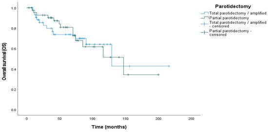 OS, DFS, and LC rates were higher in patients submitted to RT for primary tumor management than those who were not, but without statistical significance (p: 0.14; 0.44; 0.09, respectively). Figure 1 showed that the OS in patients submitted to partial or total parotidectomy was 50% and 40%, respectively, after 125 months (p: 0.89), so more patients who had undergone partial parotidectomy survived than those who had undergone complete removal of the parotid gland.